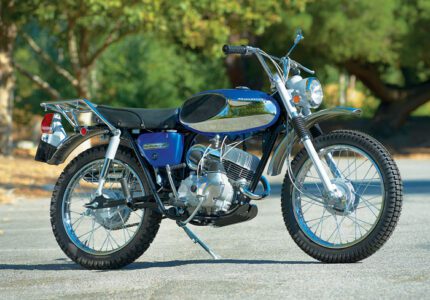 The TMX was first introduced in 1968 or 1969 — the timeline is uncertain. A 1968 TMX was advertised for sale recently. On the other hand, a 1970 brochure stated that the TMX was a new model. It featured a welded tubular steel frame with a built-in skid plate, relatively long suspension for the 1960s, a dual rear sprocket to allow easy gearing changes and a high exhaust. Advertising brochures boasted that the drum brakes were not only larger than necessary but also waterproof. The engine had a ball and roller bearing lower end, a chromed cylinder bore and oil injection lubrication. It made 11 horsepower and was good for a claimed 60mph. A back rack came with the bike. It is uncertain how many were made, but TMXs come up for sale from time to time.