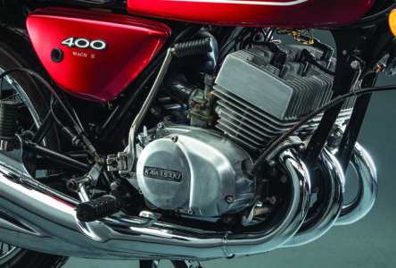 By 1974, the 350cc S2 became the 400cc S3 when Kawasaki enlarged the engine by taking the bore from 53mm to 57mm. A pressed together crankshaft in horizontally split cases turns on six bearings. Connecting rods mate to the throws via roller bearings, while the piston gudgeon pins are in needle bearings. “Oil for lubricating the engine’s internals is supplied by a plunger-type pump whose delivery rate is controlled by the amount of throttle opening and the engine rpm,” the Cycle World test notes. “This oil under pressure from the pump is delivered through check valves into the cylinder intake ports where it mixes with the incoming fuel/air mixture to lubricate the connecting rods and piston pin bearings.”