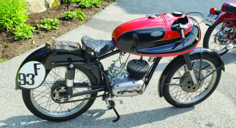 The first motorcycle was a 125cc 2-stroke and is clearly inspired by Moto Parilla. The 150 Lusso Sport and Super Sport version was displayed at the Milan Show in 1952. Later the same year, the 160cc engine was added. At the Salone Di Milano in 1954, they exhibited the 125cc 4-stroke Turismo Lusso, an interesting twin-cylinder SOHC 175 with chain-driven cams, along with the Gran Turismo 2-stroke 150cc and 175cc models. In Italy during the 1950s, motorcycles all had gear levers on the right side. However, the Fratelli Ferrari has the gear lever on the left side.
